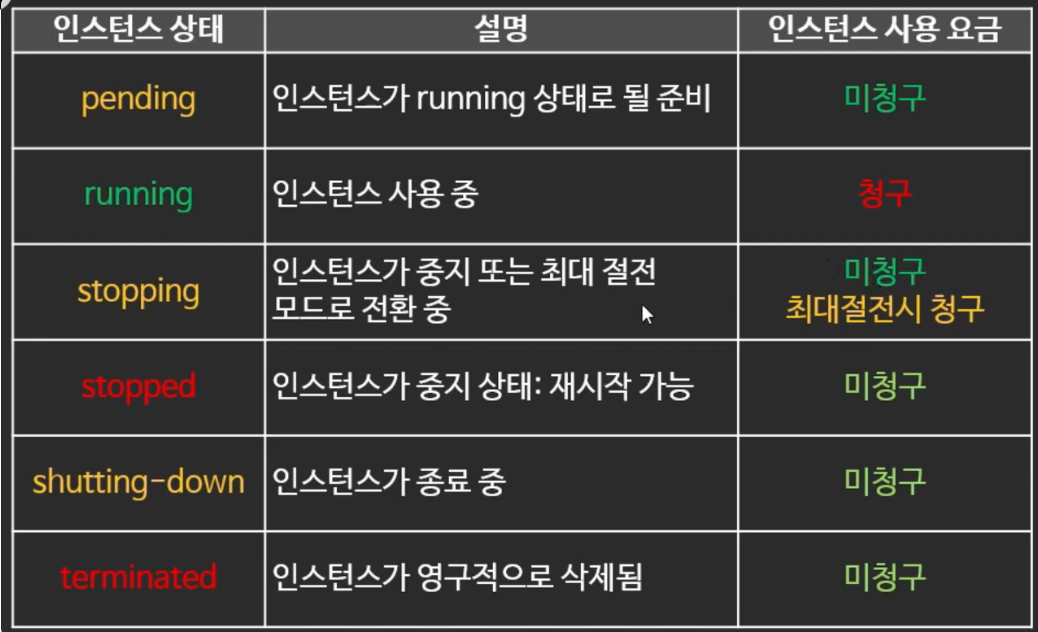 Amazon EC2 인스턴스는 시작한 순간부터 종료될 때까지 다양한 상태로 전환된다.